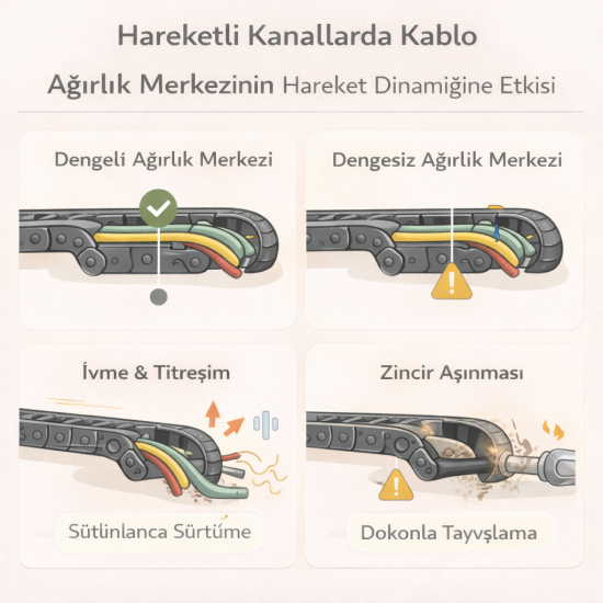 Hareketli kablo kanallarında kablo ağırlık merkezinin zincir hareketine etkisi nedir? Dengesiz yük dağılımının ivme, titreşim ve zincir ömrü üzerindeki sonuçları teknik olarak inceleniyor.