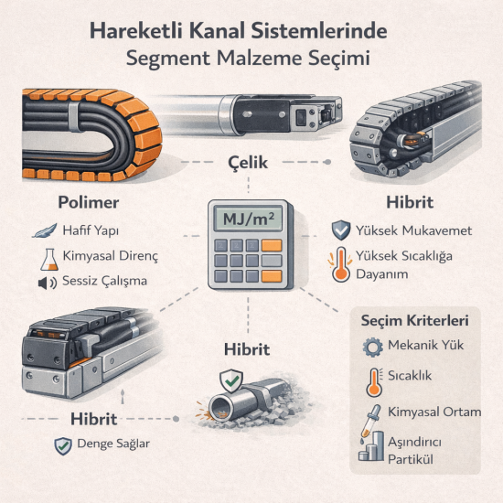Hareketli kanal sistemlerinde segment malzeme seçimi nasıl yapılır? Mekanik dayanım, sıcaklık, kimyasal direnç ve ömür kriterlerine göre teknik seçim rehberi.