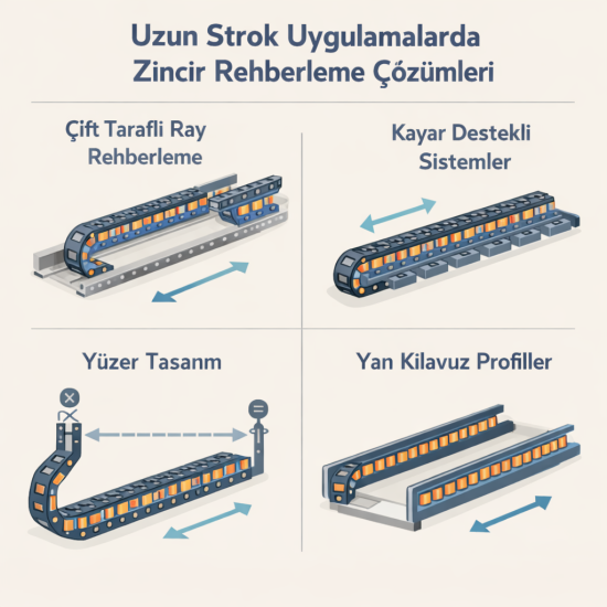 Plastik ve çelik enerji zincirlerinin dayanım, titreşim direnci, yük kapasitesi ve çevresel performans kriterlerine göre karşılaştırılması; doğru sistem seçimi için teknik bir rehber sunar.