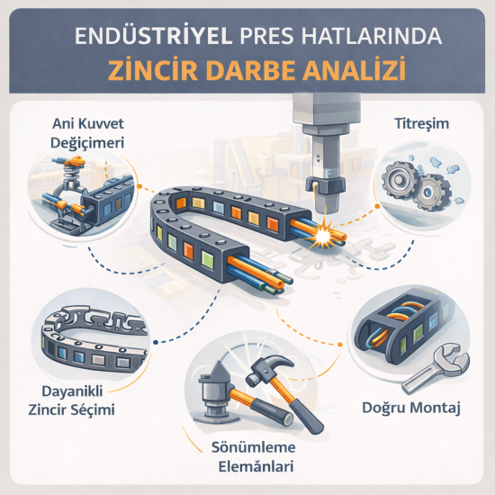 Endüstriyel pres hatlarında zincir darbe analizi, hareketli kablo taşıma sistemlerinin güvenli çalışması için kritik bir mühendislik konusudur. Pres makinelerinde oluşan ani kuvvetler ve titreşimler enerji zinciri sistemlerini doğrudan etkileyebilir.