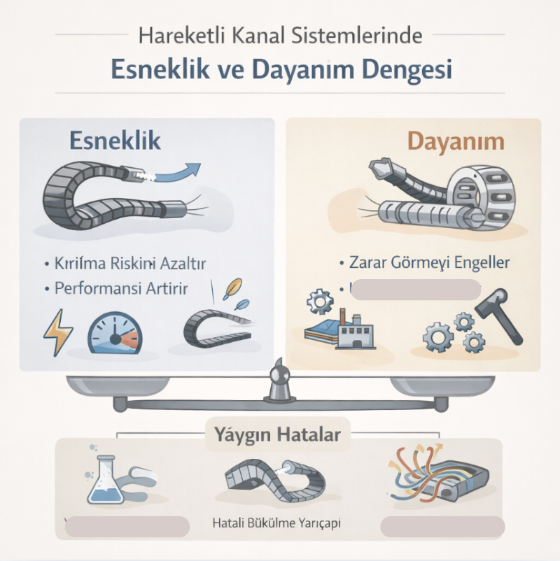 Hareketli kanal sistemlerinde başarı, tek bir özelliği maksimize etmekten değil, denge kurmaktan geçer. Esneklik olmadan hareket olmaz, dayanım olmadan süreklilik sağlanamaz.