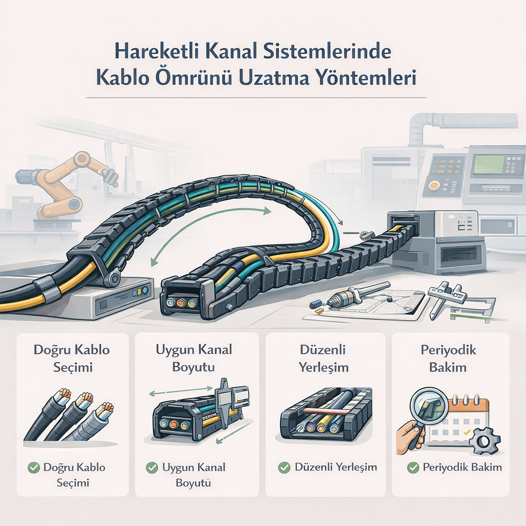 Endüstriyel tesislerde hareketli kanal sistemleri, sürekli hareket eden makinelerin güvenli şekilde çalışmasını sağlayan önemli altyapı elemanlarından biridir. Robotik sistemler, otomasyon hatları ve CNC makinelerinde kablolar sürekli hareket eder. Bu durum kablolar üzerinde mekanik stres oluşturur. Bu nedenle hareketli kanal sistemlerinde kablo ömrünü uzatma yöntemleri, hem bakım maliyetlerini azaltmak hem de üretim sürekliliğini sağlamak açısından kritik bir rol oynar.