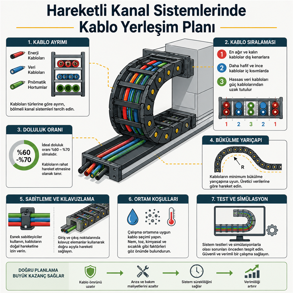 Hareketli kanal sistemlerinde kablo yerleşim planı, sistem performansının temel belirleyicisidir. Doğru sıralama, uygun doluluk oranı, bükülme yarıçapına dikkat edilmesi ve çevresel koşulların göz önünde bulundurulması, sistemin uzun ömürlü ve sorunsuz çalışmasını sağlar.