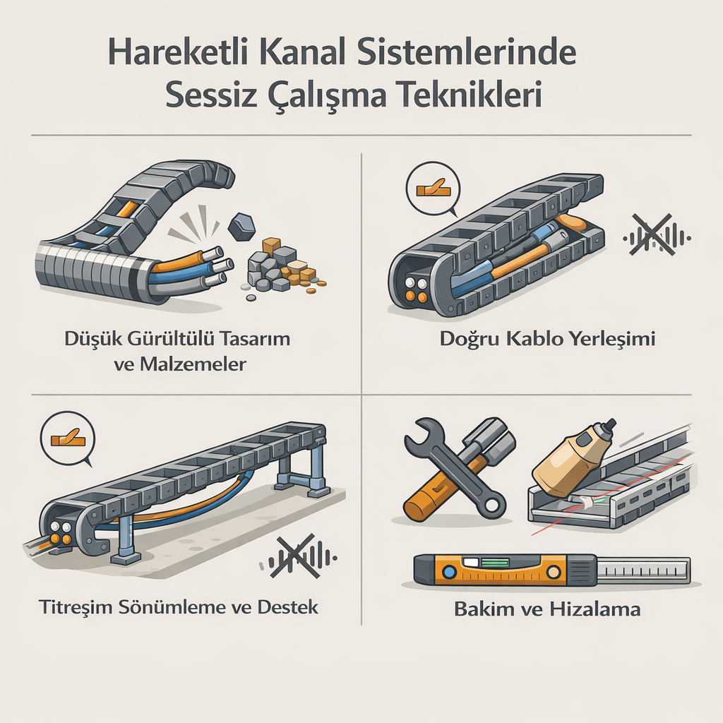 Endüstriyel üretim hatlarında kullanılan hareketli kanal sistemleri, kabloların güvenli bir şekilde taşınmasını sağlarken sürekli hareket halinde oldukları için zamanla gürültü oluşturabilir. Özellikle otomasyon hatları, CNC makineleri, robotik sistemler ve taşıma hatlarında oluşan sesler, yalnızca çalışma konforunu değil, aynı zamanda sistem performansını da etkileyebilir. Bu nedenle hareketli kanal sistemlerinde sessiz çalışma teknikleri, modern tesislerde önemli bir mühendislik gereksinimi haline gelmiştir.