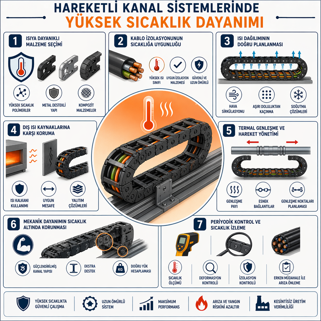 Hareketli kanal sistemlerinde yüksek sıcaklık dayanımı, zorlu endüstriyel koşullarda güvenli ve kesintisiz çalışma için vazgeçilmez bir gerekliliktir. Doğru malzeme seçimi, uygun kablo kullanımı ve etkili ısı yönetimi ile sistemler yüksek sıcaklıklarda dahi stabil şekilde çalışabilir.