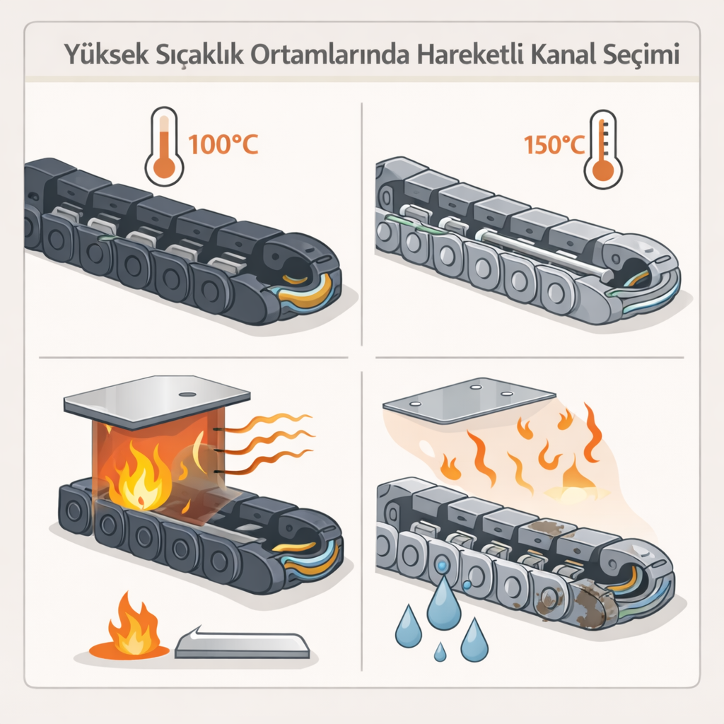 Ortam sıcaklığı 120°C üzerindeyse veya yoğun radyan ısı varsa çelik enerji zincirleri daha güvenli bir çözümdür.